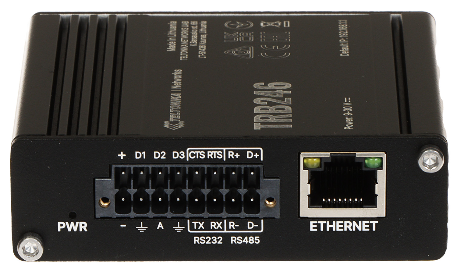 Brama Teltonika TRB246 zasilana jest przez 2 piny umieszczone w 16-pinowej przemysłowej listwie zaciskowej