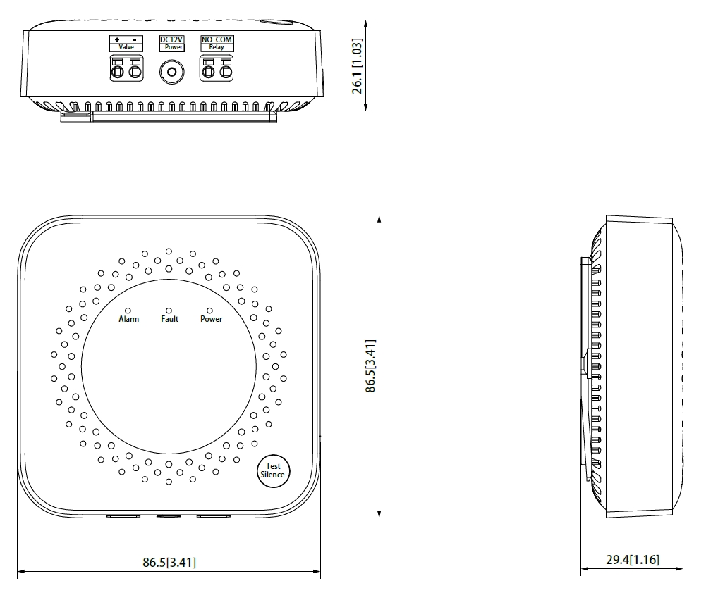 | Wybrane cechy: | Wyjście przekaźnikowe : NO (sterowanie wentylatorami poprzez załączanie napięcia), Wyjście sterujące zaworem odcinającym dopływ gazu Czas reakcji pomiaru ≤ 30 s Funkcja wyciszenia alarmu Przycisk TEST/SILENCE Diody LED sygnalizujące stan pracy urządzenia |
