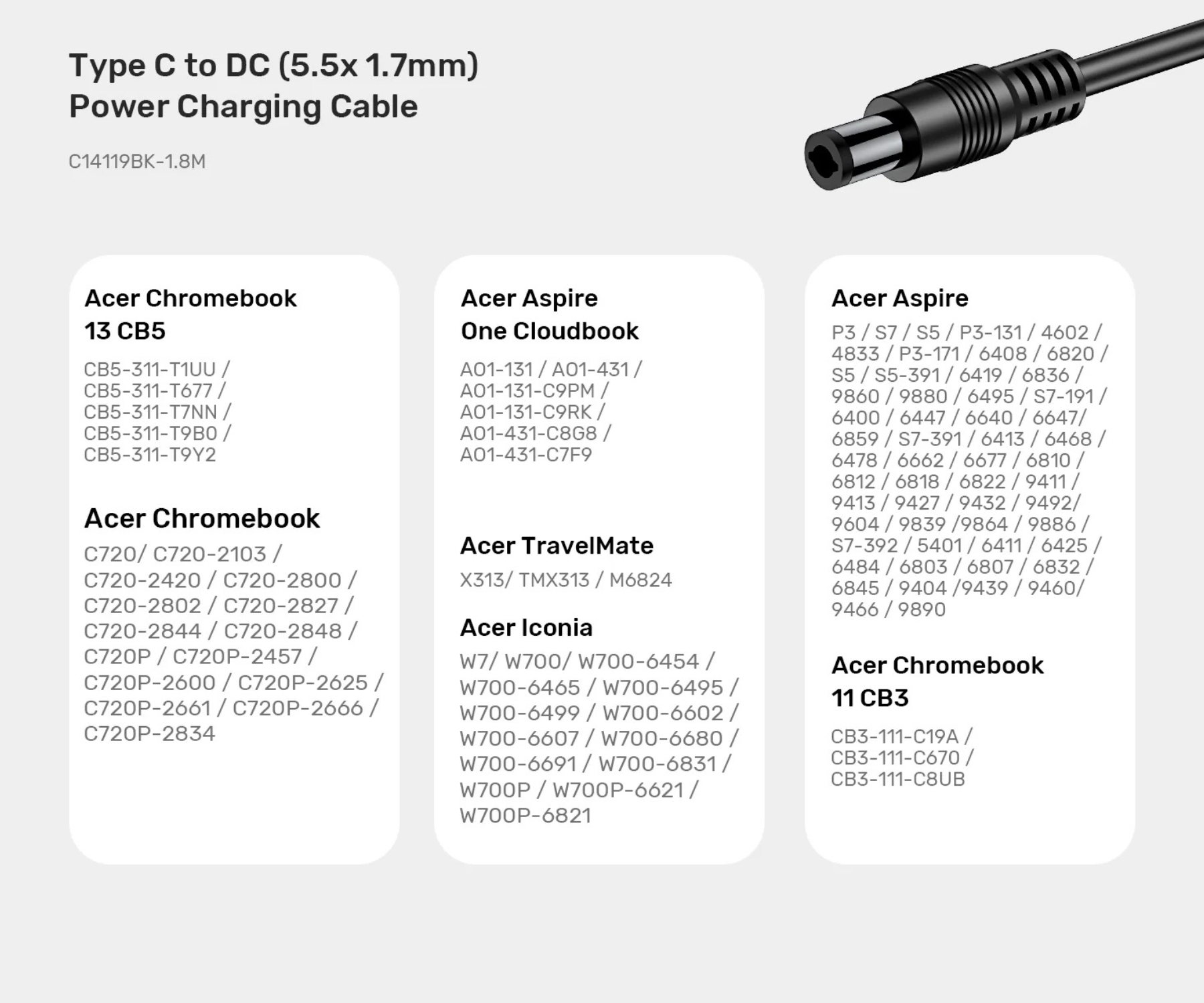 Kabel C14119BK-1.8M USB-C do DC 5.5 x 1.7 mm został zaprojektowany do ładowania laptopów Acer i obsługuje zasilanie USB-C PD do 65W (20V / 3.25A), stanowiąc wygodną alternatywę dla klasycznego zasilacza. Wbudowany inteligentny chip dba o stabilne i bezpieczne ładowanie, a przewód o długości 1.8 m wykonany z PVC i miedzi zapewnia trwałość oraz wygodę codziennego użytkowania.